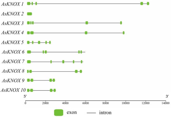 The Exon-Intron structures of AsKNOX genes were analyzed and plotted with TBtools. As shown in Figure 2, the exon numbers of these AsKNOX genes ranged from one to five, in which AsKNOX2 was the only member that had one exon. Five AsKNOX genes (AsKNOX1, AsKNOX3, AsKNOX5, AsKNOX6, and AsKNOX7) showed with the structures of 5 exons and 4 introns. In addition, all the other four AsKNOX genes (AsKNOX4, AsKNOX8, AsKONX9, and AsKNOX10) had four exons and three introns. Among these AsKNOX genes, AsKNOX9 and AsKNOX10 had similar gene structures with each other, which might suggest that these two genes have similar functions in garlic. Additionally, the gene structure of AsKNOX3 was also somewhat similar to that of AsKNOX4, although the 2nd exon of AsKNOX4 was spliced into two small exons (2nd and 3rd exon) in AsKNOX3.