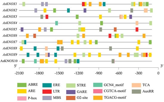 Putative cis-elements in the promoter regions of AsKNOX genes. Different colored rectangles denote different cis-elements with various biological functions.