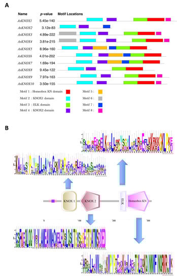 Furthermore, to obtain insights into the diversity of conserved motif compositions in AsKNOX proteins, the protein sequences of these 10 AsKNOX genes were assessed using the MEME program. As shown in Figure 4, eight conserved motifs were identified among these 10 AsKNOX proteins, of which the first four motifs (motif 1 to 4) correspond to the 4 typical KNOX domains (Homeobox KN domain, KNOX1 domain, ELK domain, and KNOX2 domain). These 4 typical domains of KNOX protein were owned by all the AsKNOX proteins, except for AsKNOX2, which contains 2 of these 4 typical domains (KNOX1 domain and KNOX2 domain). Additionally, the remaining four motifs (motif 5 to 8) were scattered among nine of the 10 AsKNOX homologs (Figure 4A). Furthermore, based on the stacked motif logos of those four typical domains among AsKNOX proteins, the KNOX2 domain, and Homeobox KN domain showed relatively more conservation than the KNOX1 domain and ELK domain (Figure 4B) among these 10 AsKNOX proteins. To more accurately understand the specific positions of these conserved domains in their protein sequences, the Pfam website was used to compare the sequences and to retrieve the detailed positions of each domain, which are listed in Supplemental Table S1.