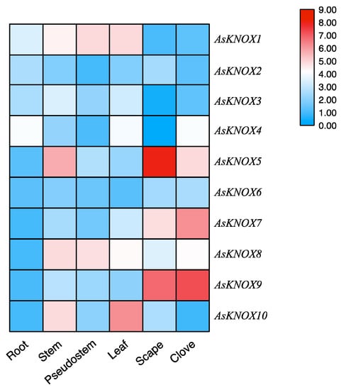 To primarily investigate the functions of AsKNOX genes, their expression patterns were analyzed among six different garlic tissues including root, stem, pseudostem, leaf, scape, and clove. As shown in Figure 6, different expression patterns were found for these 10 AsKNOX genes. AsKNOX1, AsKNOX5, AsKNOX8 and AsKNOX10 were expressed in stem that contains the apical meristem of garlic. Both AsKNOX1 and AsKNOX8 were expressed in the pseudostem and leaf, while AsKNOX8 was barely expressed in root and AsKNOX1 had rarely expression in both scape and clove. AsKNOX2 showed low expression levels among all the investigated garlic tissues, especially for the pseudostem and clove. Compared with other garlic tissues, AsKNOX6 had more rarely expressions in root and leaf. Expressions of AsKNOX4 in the root, leaf, and clove were higher than other tissues, especially for the scape. Similarly, AsKNOX3 also showed very low expression in the scape. AsKNOX5, AsKNOX7, and AsKNOX9 were all highly expressed in garlic scape and clove, and higher expression in garlic stem was also found for AsKNOX5. The expression levels of AsKNOX10 were much higher in garlic stem and leaf, while almost no expressions of AsKNOX10 were shown in garlic root and clove.