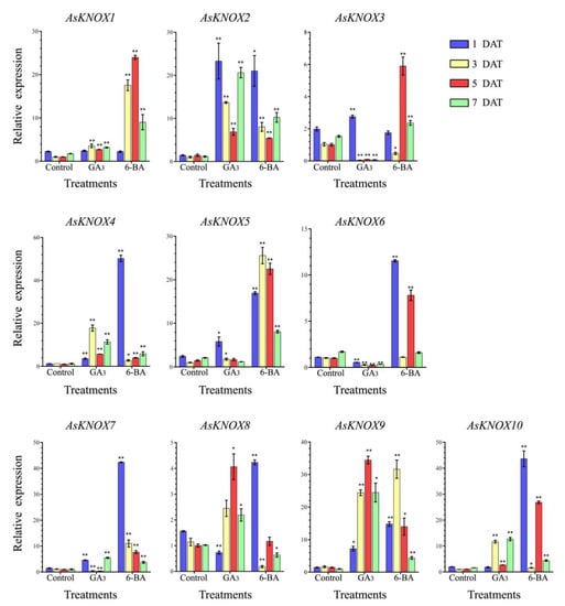 For the 6-BA treatments, the expressions of AsKNOX2, AsKNOX4, AsKNOX5, AsKNOX7, AsKNOX9, and AsKNOX10 showed obvious increases than their controls at all sample points. AsKNOX1 and AsKNOX3 had no obvious changes compared with their controls at the 1 DAT, while the expressions of AsKNOX1 and AsKNOX3 at the 3 DAT were significantly increased and decreased than their controls, respectively. Expressions of AsKNOX6 had no obvious difference compared with its controls for the 3 DAT and 7 DAT samples, while its expressions were significantly increased compared with the controls at 1 DAT and 5 DAT. For the 3 DAT and 7 DAT samples, the expressions of AsKNOX8 were obviously decreased compared with its controls.