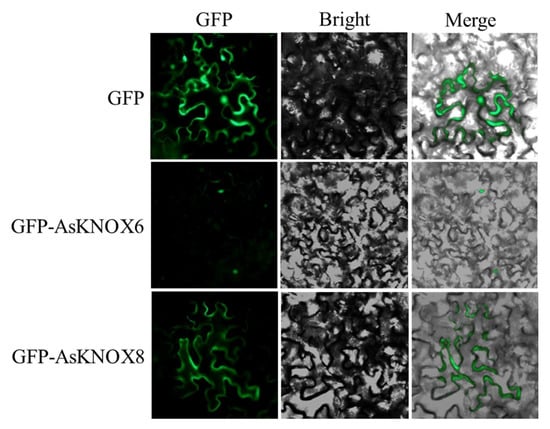 The GFP signal of GFP-AsKNOX6 was successfully observed in the nucleus, which was consistent with the predicted results in Table 1. However, the GFP signal of GFP-AsKNOX8 was unexpectedly localized on the cytoplasm.