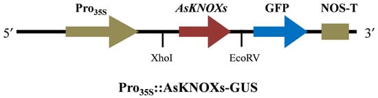 To preliminarily check the predicted subcellular localizations of AsKNOX proteins, two of them (AsKNOX6 and AsKNOX8) were randomly selected for experimental verification. Full-length coding sequences of AsKNOX genes without stop codons were amplified using gene-specific primers and they were ligated into pGreen 0229 vector containing the green fluorescent protein (GFP) to generate GFP-AsKNOX fusion proteins. Sequence information of all these primers were provided in Table S4. The connection mode of AsKNOX genes and vector was shown in Figure 9. The Gene Star Seamless Cloning Kit was used to fuse the AsKNOX gene sequences to the linearized plasmid that was obtained through the double enzyme digestion with Xhol and EcoRV. The recombinant constructs were checked by sanger sequencing and were transfected into the abaxial side of 4- to 6-week-old N. benthamiana leaves by infiltration with strain GV3101 (Agrobacteriumt tumefaciens). The GFP empty vector was served as the positive control. After 48 h co-infiltration, the GFP signals in N. benthamiana leaves were observed using an automatic fluorescence microscope (Olympus, Tokyo, Japan) with 488-nm excitation.