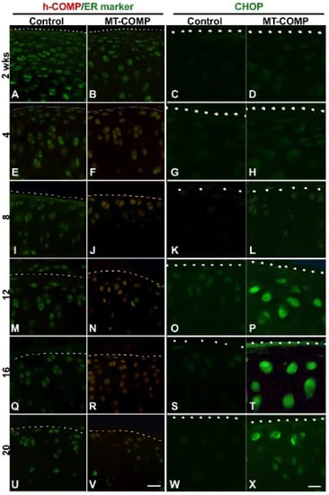 - Posey, K.L.; Coustry, F.; Veerisetty, A.C.; Liu, P.; Alcorn, J.L.; Hecht, J.T. Chop (Ddit3) Is Essential for D469del-COMP Retention and Cell Death in Chondrocytes in an Inducible Transgenic Mouse Model of Pseudoachondroplasia. Am. J. Pathol. 2012, 180, 727–737. [Google Scholar] [CrossRef] [PubMed]