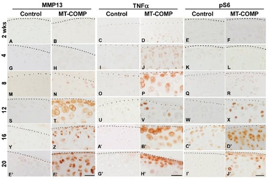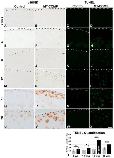 2.4. Joint Degeneration in MT-COMP Mice Is Validated by OA Scoring
