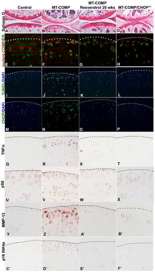 2.5. Prevention of Joint Degeneration in MT-COMP Mice with Resveratrol Treatment or Ablation of CHOP