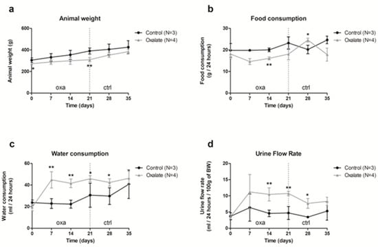 Impact of the 5-week regimen (3 weeks of OXA diet + 2 weeks of control diet) on metabolic parameters: (a) animal weight (grams); (b) food consumption (grams/24-h); (c) water consumption (mL/24-h); (d) urine flow rate (mL/24-h/100 g of body weight). Results are expressed as mean ± SD. * p ≤ 0.05; ** p ≤ 0.01, versus control. Control n = 3, oxalate n = 4.