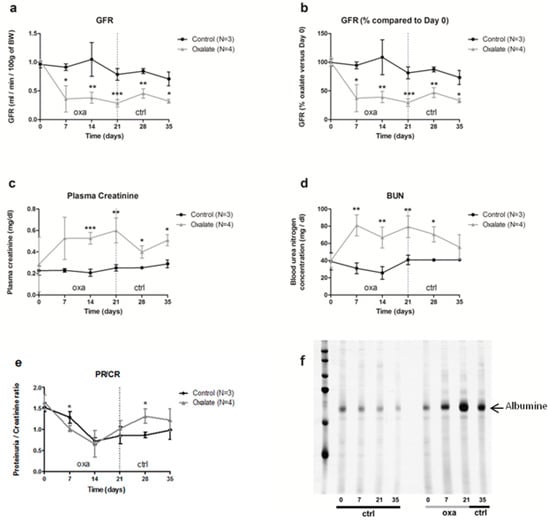 Impact of the 5-week regimen (3 weeks of OXA diet + 2 weeks of control diet) on kidney function: (a) glomerular filtration rate (mL/min/100 g of body weight); (b): percentage of GFR compared to day 0 of the diet (%); (c) plasma creatinine concentration (mg/dL); (d) blood urea nitrogen concentration (mg/dL); (e) ratio total protein/creatinine concentration (mg/24-h/100 g of body weight); (f) profile of urinary proteins excreted by ctrl and oxa rats. The 24 h urine samples were subjected to 10% SDS-PAGE. Following electrophoresis, the gels were silver stained using the ProteoSilver Plus Kit (Sigma-Aldrich). Results are expressed as mean ± SD. * p ≤ 0.05; ** p ≤ 0.01; *** p ≤ 0.001, versus control. Control n = 3, oxalate n = 4.