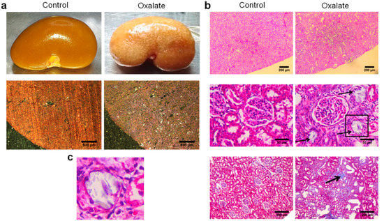 Representative morphological analyses of the kidneys of rats treated with OXA diet compared to controls: (a) morphology of the right kidney after its retrieval (upper line) and observation of kidney section under polarized light showing presence of crystals within the cortex; (b) periodic acid shift staining of sliced kidney showing massive cortical disorganization (upper line), presence of several atrophied tubules (middle line) and areas of fibrosis (lower line); (c) enlargement of the atrophied tubule highlighted with a black square in subfigure b showing the presence of crystals within the tubular lumen.