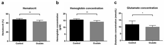 Impact of the 3-week OXA diet on systemic parameters: (a) hematocrit (%); (b) hemoglobin concentration (g/dL); (c) glutamate concentration (mmol/L). Results are expressed as mean ± SD. * p ≤ 0.05; ** p ≤ 0.01. Control n = 6, oxalate n = 18.