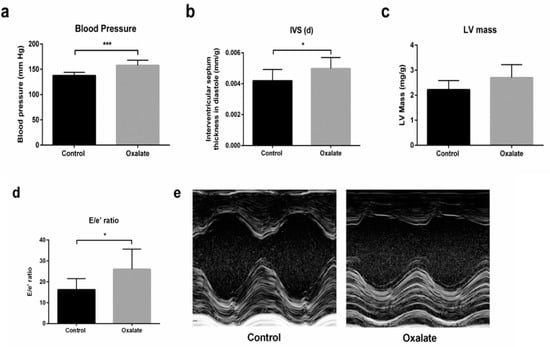 Impact of 3 weeks of an OXA diet on blood pressure and cardiac function: (a) blood pressure (mmHg); (b) IVS;d (mm/kg)—intraventricular diastolic septum thickness; (c): LV mass (mg/kg)—left ventricular mass; (d) E/e’ ratio; (e) representative images in both experimental groups at parasternal short axis view of the LV with M-mode. Results are expressed as mean ± SD. * p ≤ 0.05; *** p ≤ 0.001. Control n = 5, oxalate n = 27.