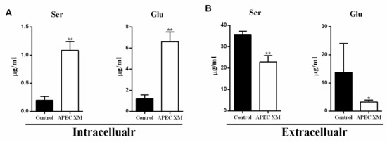 APEC XM infection promotes uptake of serine, and glutamate in bEnd.3 cells at 1 h. (A) The intracellular content of serine and glutamate; (B) The extracellular content of serine and glutamate. Data are from one experiment representative of three independent experiments, with six replicates per group. Data represent means ±SD. * p < 0.05, ** p < 0.01.