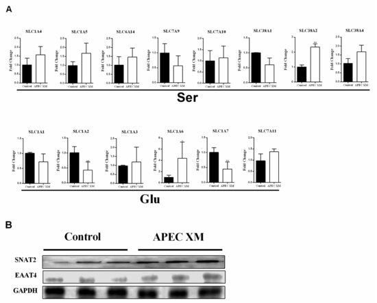 Amino acid uptake mainly depends on amino acid transporters, and amino acid transporters are responsible for maintaining host AA metabolism balance or defending against pathogen infection by regulating AA levels [17,33,34,35]. To determine whether the changes of Ser and Glu uptake are mediated through amino acid transporters in bEnd.3 cells at 1-h post-APEC XM infection, we measured the expression levels of Ser, Glu transporters. At the mRNA level, the expression of slc38a2 (SNAT2, sodium-dependent neutral amino acid transporter 2) coding for transporters common to Ser increased significantly at 1 h post-infection (Figure 2A), while the mRNA expression levels of the other Ser transporters (slc1a4, slc1a5, slc6a14, slc7a9, slc7a10, slc38a1, and slc38a4) showed no significant differences (Figure 2A). The expression levels of the transporters slc1a6 (EAAT4, excitatory amino acid transporter 4), shared by Glu, were significantly increased 1 h after infection (Figure 2A); however, the mRNA expression levels of slc1a2 and slc1a7 were significantly reduced difference and others showed no significant difference at 1 h post-infection (Figure 2A).