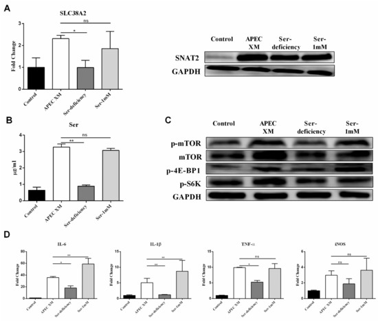 Then, we explored whether the change of Ser transport from extracellular to intracellular promotes increased expression of SNAT2 during APEC XM infection, and is further involved in activating the mTOR pathway and inducing inflammatory responses. We infected the bEnd.3 cells with APEC XM in the 1 mM Ser supplement or the Ser deficiency medium for 1 h. In the Ser deficiency group, the slc38a2 gene and SNAT2 expression were significantly reduced when compared with the APEC XM infection group as well as the 1 mM Ser supplement group (Figure 4A). Meanwhile, the intracellular Ser level in the Ser deficiency group showed no significant change compared with the control group during APEC XM infection (Figure 4B). In the 1 mM Ser supplement group, the intracellular Ser level was significantly increased compared with the control group after APEC XM infection. These results suggest that the increase of intracellular Ser is mainly caused by SNAT2 transport, which transports extracellular Ser into intracellular during infection.
