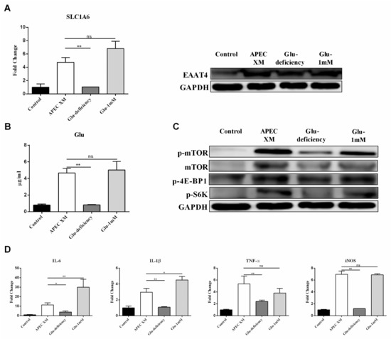 Similarly, we also explored whether the change of Glu in extracellular and intracellular promotes the increased expression of EAAT4 during APEC XM infection, and then further investigated the effect of increased intracellular Glu on activating the mTOR pathway and inducing inflammatory responses. In the Glu deficiency group, the slc1a6 gene and EAAT4 expression were significantly reduced when compared with the APEC XM infection group as well as the 1 mM Glu supplement group (Figure 5A). Meanwhile, the intracellular Glu level in the Glu deficiency group showed no significant change compared with the control group during APEC XM infection (Figure 5B). In the Glu deficiency group, the intracellular Glu level was significantly decreased compared with the APEC XM infection group, as well as the 1 mM Glu supplement group. These data suggest that APEC XM infection can contribute to transporting extracellular Glu into intracellular by increasing the expression of EAAT4.