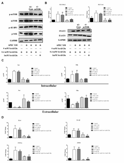 The effect of mTOR silencing on Ser or Glu uptake, expression of SNAT2 or EAAT4, activation of mTORC1 pathway and inflammation. (A) Western blotting showed the downregulated activation of the mTORC1 pathway, respectively in mTOR-silenced cells cultured in the compete, the 1 mM Ser supplement or the 1 mM Glu supplement medium, compared with APEC XM-infected cells. GAPDH was used as the reference control for the blotting. (B) The mRNA transcription and expression of Scl38a2 and Scl1a6, respectively in mTOR-silenced cells cultured in the complete, the 1 mM Ser supplement or the 1 mM Glu supplement medium, compared with APEC XM-infected cells. GAPDH and GAPDH were used as the reference control for RT-PCR and the blotting. RT-PCR data are from one experiment representative of three independent experiments, with three to six replicates per group. Data represent means ± SD. ns: not significant, * p < 0.05, ** p < 0.01. (C) The intracellular and extracellular content of Ser and Glu, respectively in mTOR-silenced cells cultured in the complete, the 1 mM Ser supplement or the 1 mM Glu supplement medium, compared with APEC XM-infected cells. Data are from one experiment representative of three independent experiments, with three to six replicates per group. Data represent means ± SD. ns: not significant, * p < 0.05, ** p < 0.01. (D) The mRNA transcription of pro-inflammatory factors, respectively in mTOR-silenced cells cultured in the complete, the 1 mM Ser supplement or the 1 mM Glu supplement medium, compared with APEC XM-infected cells. GAPDH was used as the reference control for RT-PCR. Data are from one experiment representative of three independent experiments, with three to six replicates per group. Data represent means ± SD. ns: not significant, * p < 0.05, ** p < 0.01.