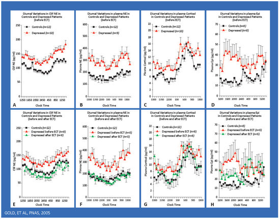 As noted earlier, as examples of the activation of the stress response, we first noted that both CSF and plasma norepinephrine and epinephrine are elevated around the clock in drug-free patients with melancholia in hourly samples taken for 30 consecutive hours (Figure 1). Both compounds are arousal-producing and anxiogenic in brain and transduce multiple autonomic and metabolic aspects of the stress response [8,10,20]. We also found norepinephrine spillover was significantly increased in mild–moderately melancholic depressed patients [20] (Figure 2).