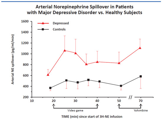 As noted earlier, we first demonstrated that the CRH system was activated in melancholic patients [11], as were indices of increased norepinephrine secretion, as assessed hourly through indwelling canullae in the antecubital space and spinal canal (Figure 1). The highly elevated levels in melancholia fell to normal after electroconvulsive shock induced remission [8,10,20]. We also showed that melancholic depressed patients have increased norepinephrine spillover into arterial plasma at rest, in response to a video game, and in response to yohimbine, an alpha-2 noradrenergic antagonist (Figure 2) [20]. Along with CRH hypersecretion in melancholia, these lead to further anxiety and arousal, decreased sleep, and decreased food intake and sexual activity. Once again, chronic stress in experimental animals leads to these changes.