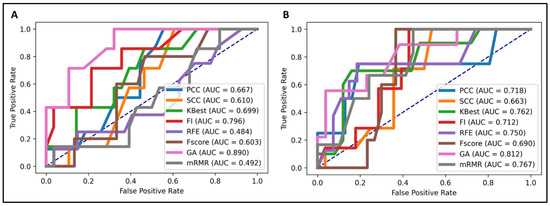 Figure 1. Predictive performance of different feature selection techniques in the NSCLC radiogenomics model. The genetic algorithm (GA) demonstrated the most favorable performance. (A) EGFR mutation prediction (area under the curve (AUC) = 0.89), (B) KRAS mutation prediction (AUC = 0.812).