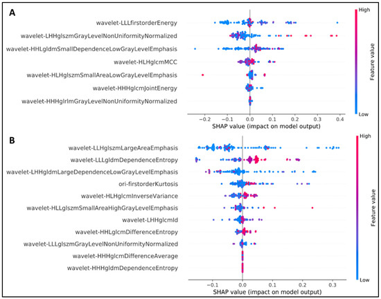 Figure 2. SHAP analysis to explain the crucial features of our NSCLC radiogenomics models. (A) EGFR mutation status, (B) KRAS mutation status.