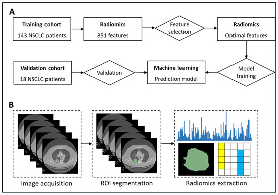 Figure 3. Prediction of EGFR mutation using radiomics, feature selection, and machine learning algorithms. (A) Study framework. (B) Workflow of radiomics.