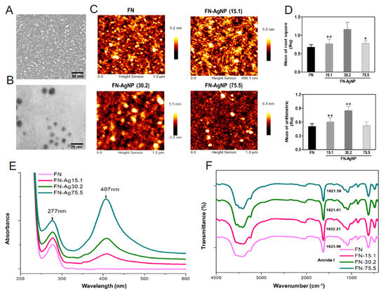 Materials characterization. The preparation procedure of fibronectin-silver nanoparticle (FN-Ag) composites. (A) SEM images of AgNP and (B) TEM image of the diameter of AgNP was about 5 nm. (C) Preparation of FN-AgNP nanocomposites. The surface topography of pure FN and FN-AgNP containing various amount of Ag were observed by AFM. (D) Rq is the roughness, while Ra represents as the average roughness of each material. * p < 0.05, ** p < 0.01: greater than the control (FN). (E) UV-Visible absorption peak of pure FN and FN-Ag containing various amount of AgNP (~15.1 ppm, ~30.2 ppm and ~75.5 ppm). (F) FTIR spectrum of pure FN and FN-Ag nanocomposites in the total wave number 400 cm−1 to 4000 cm−1. Data results from one representative experiment of three independent experiments.