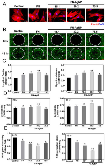 It has been reported that co-culture of fibroblasts and endothelial could significantly enhance the angiogenesis of endothelial cells. It was indicated that there are intimate communications between fibroblasts and endothelial cells for angiogenesis, and the paracrine effect may play a crucial role in these communications [44]. Therefore, the effects of different materials on biocompatibility and the biological activity of fibroblast (HSF) were also investigated in this study. The assessment of actin fiber staining via phalloidin-rhodamine conjugate is demonstrated in Figure S1A and Figure 2A. In control group, the actin fibers of HSF and MSC were mostly near the cell body and exhibited in circumferential shape. While seeding cells with FN-AgNP 30.2 ppm, the actin fibers became more extended. The length of actin fiber was much longer in MSC culturing in FN-AgNP nanocomposites, especially in FN-AgNP 30.2 ppm (~1.46-fold) and following by FN-AgNP 15.1 ppm (~1.35-fold), pure FN (~1.23-fold) and FN-AgNP 75.5 ppm (~1.20-fold). The above condition could also be observed in HSF, but had a less extension comparing to MSCs: FN-AgNP 30.2 ppm (~1.39-fold), FN-AgNP 15.1 ppm (~1.28-fold), pure FN (~1.20-fold) and FN-AgNP 75.5 ppm (~1.15-fold) (Figure S1C and Figure 2C).