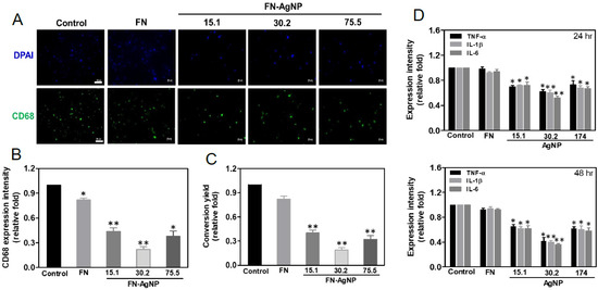 CD68 expression of macrophages on various materials at 96 h and the expression of pro-inflammatory cytokines (TNF-α, IL-1β, IL-6) at 24 and 48 h. (A) The cells were stained by primary anti-CD68 antibody and conjugated with FITC-immunoglobin secondary antibody (green color). DAPI solution was used to locate cell nuclei (blue color). The results were captured using fluorescence microscopy. Scale bar = 20 μm. (B) The expression level of CD68 was analyzed based on fluorescence intensity. (C) The conversion yield of human monocytes activation after culturing on pure FN and various concentrations of FN-AgNP for 96 h. (D) The expression of proinflammatory cytokines at 24 and 48 h was analyzed based on the expression intensity. Data are the mean ± SD (n = 3). * p < 0.05; ** p < 0.01: smaller than the control. Control group = glass cover slide.