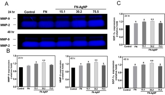 The MMP enzymatic activities and SDF-1α protein expression in MSCs culturing on various materials at 24 and 48 h. (A) The representative MMP-2 and MMP-9 zymogram for (a) 24 and (b) 48 h is shown. The semiquantitative meas-urement of (B) MMP-9 and (C) SDF-1α protein expression revealed a significantly greater expression culturing MSCs with FN-AgNP 30.2 ppm at 24 and 48 h. Data are presented as mean ± SD (n = 3). * p < 0.05; ** p < 0.01: greater than the control. Control group = glass cover slide.