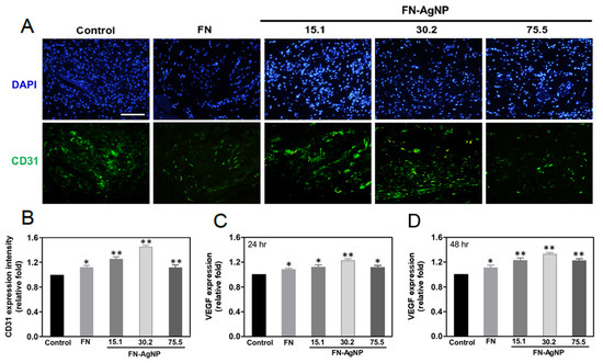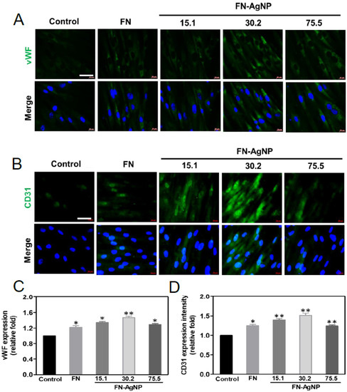 Immunofluorescence staining analysis can be clearly observed in Figure 5A,B, to characterize the expression of EC marker (CD31 and vWF) after seeded MSCs on FN-AgNP for 7 days. Figure 5C,D demonstrate the semi-quantitative data of CD31 and vWF expression. The CD31 and vWF expression on FN-AgNP 30.2 ppm (CD31: ~1.52-fold, vWF: ~1.47-fold) are significantly greater than other groups [FN-AgNP 15.1 ppm (CD31: ~1.40-fold, vWF: ~1.34-fold), FN-AgNP 75.5 ppm (CD31: ~1.24-fold, vWF: ~1.29-fold) and pure FN (CD31: ~1.25-fold, vWF: ~1.22-fold)]. The above results strongly suggest that FN-AgNP nanocomposites may facilitate MSC differentiate into ECs. The differentiation capacity of MSCs induced by various materials was then evaluated. The phenotypes of endothelial cells were also observed at days three and five. After culturing MSCs with various materials, FN-Ag 30.2 ppm induced a slight expression level of endothelial markers at days three and five as compared to the control, with the immunostaining images shown in Figure S3A,B. The semi-quantitative data showed that the mineral? differentiation in the FN-Ag 30.2 ppm group was the greatest at days three and five (p < 0.01) (Figure S3C,D).