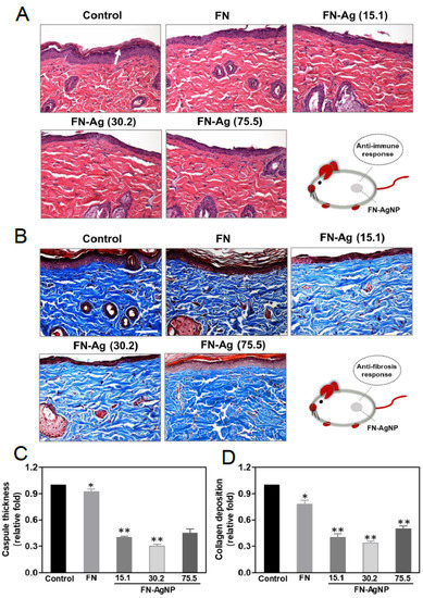 Subcutaneous implantation to measure the foreign body reactions induced by various nanomaterials. After four weeks of implantation, (A) H&E staining, white arrows indicate the thickness of the capsule, and (B) Masson’s staining were applied to process further investigations. Scale bar = 100 μm. (C,D) Semi-quantification of capsule thickness and collagen deposition was revealed based on the histology examination. Control group = glass cover slide. * p < 0.05; ** p < 0.01: less than the control (n = 5).