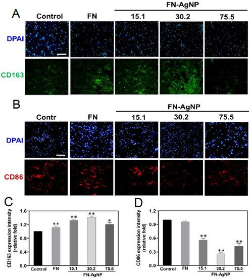 Monocytes were obtained from whole blood of healthy volunteers through Percoll density gradient centrifugation (Sigma, St. Louis, MO, USA) and culturing by the standard procedure [35]. The cell concentration was adjusted to 1 × 105 cells/mL. Cells were stored in RPMI medium [10% FBS, 1% (v/v) antibiotic (10,000 U/mL penicillin G and 10 mg/mL streptomycin)]. Twenty-four well tissue culture plates with pure FN and FN-AgNP nanocomposites coatings were firstly prepared, then 1 mL of cell suspension (1 × 105/mL) was sequentially added into each well and incubated for 96 h to reach adherent (5% CO2). Next, the cells were collected by trypsinization. Based on the different cell morphology, an inverted microscope was further applied to calculate the numbers of macrophages and monocytes. The conversion ratio was then semi-quantified.