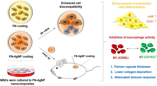 Schematic illustrations that indicate the efficacy of FN-AgNP nanocomposites. FN-AgNP nanocomposite coating enhanced the migration and differentiation ability of MSCs while inhibiting monocyte activation. Furthermore, after im-planted into the rat model, FN-AgNP induced thinner capsule formation, lower collagen deposition, and had an anti-immune response. Based on these evidences, FN-AgNP nanocomposites are suggested to be a promising surface modifi-cation strategy for biomedical applications.