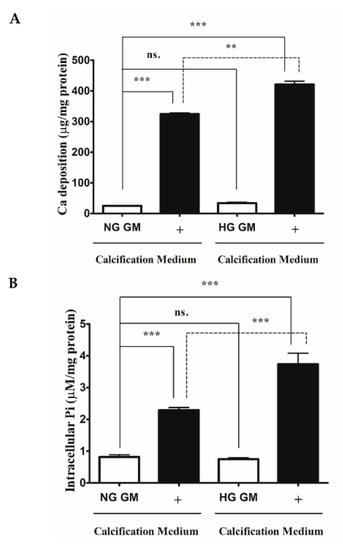 Previous studies have shown that HG promotes VSMCs mineralization [21,22]. Along lines with these studies, we showed that HG strongly aggravated the osteogenic trans-differentiation and mineralization of VSMCs in response to high Pi.