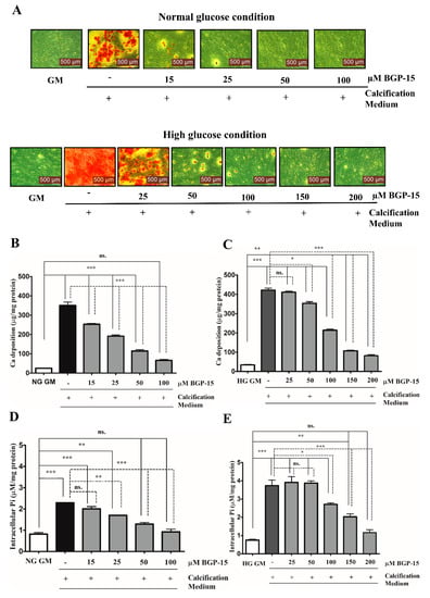 Calcium deposition by VSMCs was examined by Alizarin Red Staining, which revealed that Pi significantly increased mineral deposition compared to the untreated cells (GM) in NG (Figure 2A, upper panel) and HG conditions (Figure 2A, lower panel). We showed that BGP-15 significantly inhibited mineral deposition in a dose-dependent manner (Figure 2A).