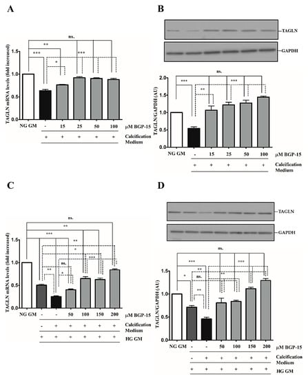 Downregulation of smooth muscle-specific markers, such as transgelin (TAGLN) and smooth muscle α-actin (ACTA-2), is a common feature of VSMC calcification and osteochondrogenic phenotypic transition [28]. Therefore, we next examined whether BGP-15 could counteract Pi-induced loss of smooth muscle-specific markers. We showed that high Pi downregulated TAGLN expression (Figure 3A,B), which was further decreased by the HG condition (Figure 3C,D). Importantly, BGP-15 counteracted Pi-induced loss of TAGLN in both conditions (Figure 3A–D).