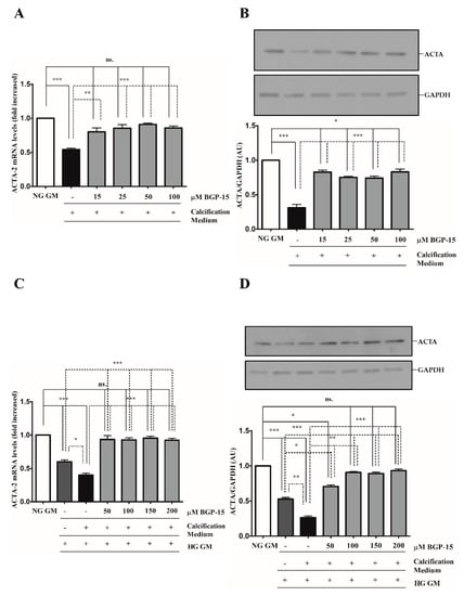 We showed that high Pi downregulated ACTA-2 expression (Figure 4A,B), which was further decreased by the HG condition (Figure 4C,D). Similar to TAGLN, the HG condition decreased ACTA-2 level compared to NG independently of high Pi (Figure 4C,D). In line with TAGLN, BGP-15 restored ACTA-2 expression in NG and HG conditions (Figure 4A–D).