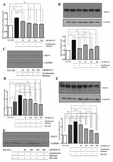 The KLF-5 transcription factor plays a critical role in VSMCs osteochondrogenic transformation and mineralization [27]. We showed that high Pi significantly induced KLF-5 mRNA expression (Figure 5A) and KLF-5 protein nuclear translocation in NG condition (Figure 5B,C), which were dose-dependently inhibited by BGP-15.