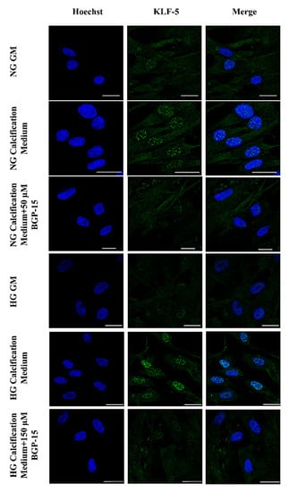 Cells were treated as described above in the presence or absence of 50 µmol/L (NG condition) and 150 µmol/L (HG condition) of BGP-15 for 10 days in 24-well plates. Cells were then trypsinized, plated to glass coverslips and further incubated for 16 h as in the growth medium or in calcification medium with or without BGP-15 as described above. Cells were then fixed with 4% paraformaldehyde, washed twice with phosphate buffered saline pH 7.4 (PBS), permeabilized with 0.5% Triton X-100, washed and blocked with 10% normal goat serum and 2% BSA for 60 min in PBS with 0.05% Tween-20 (PBS-T). Slides were then incubated overnight with KLF-5 antibody (Thermo Scientific, Waltham, MA, USA, Cat: 701885) at a dilution of 1:250 overnight at 4 °C in antibody dilution buffer (1% BSA in PBS-T), washed, then, further incubated with goat anti-rabbit IgG conjugated to Alexa Fluor 568 (Thermo Fisher Scientific, Waltham, MA, USA) at a dilution of 1:500 for 60 min. Nuclei were visualized with Hoechst. Samples were investigated with Lightning super-resolution microscopy using Leica Application Software X (Leica, Mannheim, Germany).