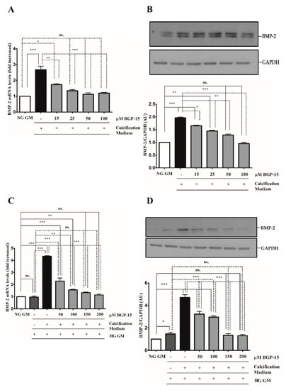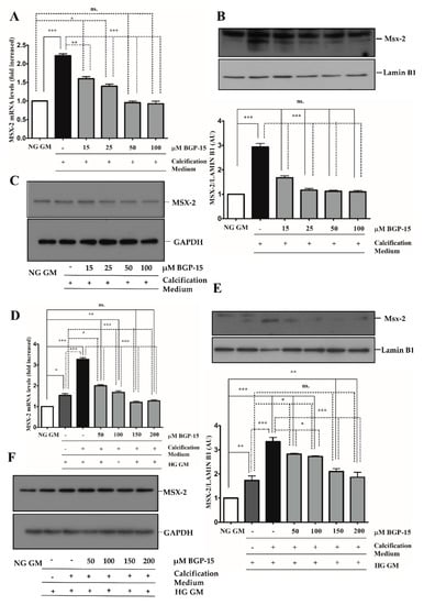 The BMP-2/Msx-2 axis has a key role in VC. Therefore, we first analyzed whether BGP-15 inhibits BMP-2 in response to high Pi under NG and HG conditions. We showed that high Pi induced BMP-2 expression (Figure 7A,B), which was aggravated by HG (Figure 7C,D) both of which were significantly reduced by BGP-15 in a dose-dependent manner.