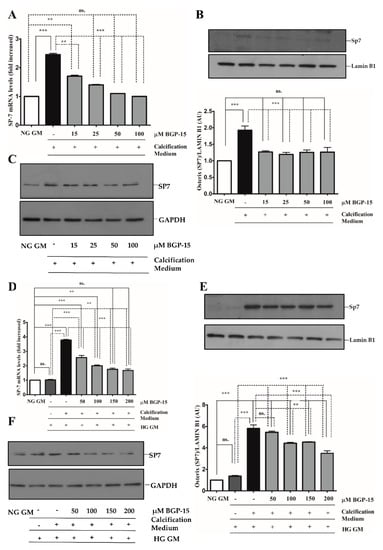 The Sp7 (Osterix) transcription factor was also an important player in osteoblast differentiation and bone formation [30]. Therefore, we next examined whether BGP-15 also inhibits Sp7 expression and its nuclear translocation. We showed that high Pi induced Sp7 mRNA expression (Figure 9A) and nuclear translocation of Sp7 protein (Figure 9B,C), which were aggravated by the HG condition (Figure 9D–F). Importantly, both Pi and Pi + high glucose-triggered Sp7 expression were blunted by BGP-15 in a dose-dependent manner.