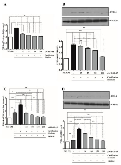Pyruvate dehydrogenase kinase-4 (PDK-4) has an important role in vascular calcification [32]. Next, we explored whether BGP-15 inhibits PDK-4 induction in response to high Pi in both NG and HG conditions. We showed that high Pi induced PDK-4 expression (Figure 10A,B), which was markedly boosted by HG (Figure 10C,D). Importantly, BGP-15 inhibited PDK-4 expression in both conditions (Figure 10A–D). Interestingly, HG also slightly elevated PDK-4 expression even when high Pi was absent (Figure 10C,D).