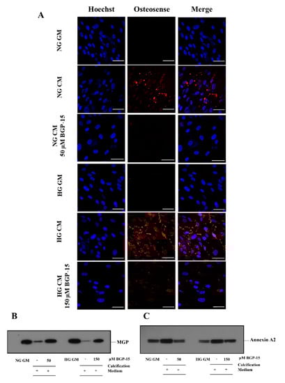 Elevated extracellular calcium in VSMC cultures was also visualized by confocal microscopy using the near-infrared-based bisphosphonate calcium tracer OsteoSense680. We showed that high Pi induced calcium deposition in VSMCs, which was aggravated by HG (Figure 11A). BGP-15 (50 µmol/L in NG and 150 µmol/L in HG conditions) significantly attenuated high Pi-induced calcification in VSMC cultures in both NG and HG conditions (Figure 11A).