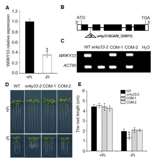 WRKY33 mediated the Pi-deficiency-induced root growth inhibition. (A) Quantitative reverse transcription polymerase chain reaction (qRT-PCR) analysis of WRKY33 expression level. Four-day-old wild-type (WT) plants were transferred to Pi-sufficient (+Pi) or Pi-deficienct (−Pi) medium for 2 days. The WRKY33 expression under Pi-sufficient (+Pi) was set as 1.0, and the Pi-deficiency treatment level was normalized to the Pi-sufficient (+Pi) level. Data are mean ± SD from three replicate experiments. (B) Schematic map of T-DNA insertion location of wrky33-2 mutant. Black boxes, lines, and triangles represent exons, introns, and the position of the T-DNA insertion, respectively. The while boxes indicate the 5′ or 3′ UTRs. (C) RT-PCR analysis of the transcriptional level of WRKY33 in WT, wrky33-2, and complementation lines (COM-1, COM-2). Water was used as a negative control. (D) Growth phenotypes of WT, wrky33-2, COM-1, and COM-2. Four-day-old seedings were transferred to a Pi-sufficient (+Pi) or a Pi-deficient (−Pi) medium for six days. (E) The statistical analysis of the primary root length as indicated in (D). Data are means ± SD from three independent experiments (n = 15; n represents the number of samples). Asterisks in (A,E) indicate a significant difference from the WT (Tukey’s test; **, p < 0.01).