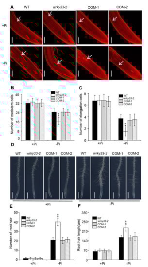 The primary root growth inhibition induced by Pi deficiency results from a reduction in root cell elongation and cell division []. To analyze the cell status under the Pi-deficient condition, we stained the roots with propidium iodide to analyze the root structure changes. The cell elongation and cell division in the wrky33-2 mutant did not show significant differences compared with the wild-type, COM-1, and COM-2 plants under Pi-sufficient (+Pi) medium (Figure 2A–C). When the plants were placed under the Pi-deficient condition, the number of meristematic and elongating cells in wild type, COM-1, and COM-2 plants were reduced; the number of these cells in wrky33-2 mutants were further decreased, which is consistent with the root growth under the low Pi condition (Figure 2A–C). In addition, we also observed that Pi deficiency stimulated root hair growth, including increased root hair length and root hair number (Figure 2D–F). The root hair growth in the wrky33-2 mutant was much stronger than those in other seedlings (Figure 2E,F). Taken together, these results indicate that WRKY33 plays an important role in Pi deficiency-induced remodeling of root structure.