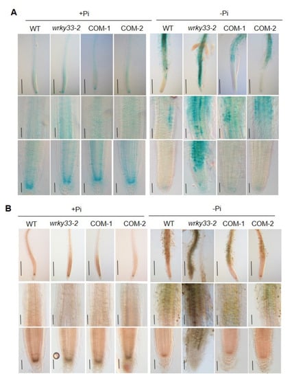 It has been proved that the Pi deficiency promoted the accumulation of Fe in roots [,,]. To investigate whether WRKY33 functions in roots to mediate the Fe accumulation under Pi deficiency, we detected the Fe content in roots by using the Perls staining method, which mainly stains labile (nonheme) Fe3+ []. Under the Pi-sufficient condition, the Fe3+ mainly accumulated in the root stem cell niche (SCN), including the quiescent center and its surrounding initials, as well as in the cortex of the root apex (Figure 3A), which is consistent with the previous result []. The Fe3+ accumulation in wild-type, wrky33-2, COM-1, and COM-2 roots did not show a significant difference (Figure 3A). When the roots were placed under the Pi-deficient medium, the Fe3+ accumulation in the SCN and the cortex was dramatically reduced; however, the root maturation zone displayed a strong Fe3+ accumulation (Figure 3A). The wrky33-2 roots showed a stronger Fe3+ staining signals than the other three materials (Figure 3A). A similar Fe distribution pattern was observed when a more sensitive Perls/DAB (diaminobenzidine) staining method was used (Figure 3B). In this method, the Perls staining was intensified with the addition of DAB to stain both Fe2+ and Fe3+ []. These results indicate that WRKY33 plays a negative role in the root to mediate the Fe accumulation under Pi-deficient conditions.