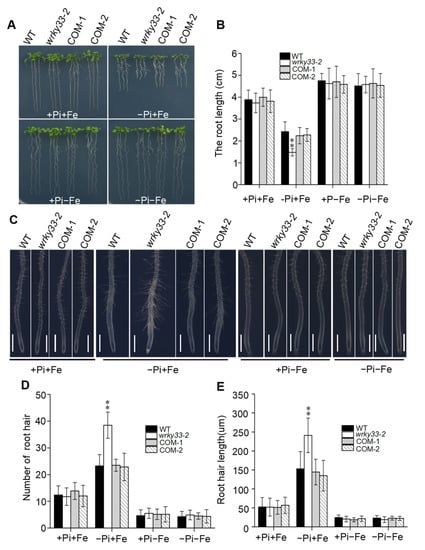 The accumulation of Fe was required to inhibit the root growth under Pi deficiency [,]. To further examine whether the intensified inhibition of primary root growth in the wrky33-2 mutant under the Pi-deficient medium was a result of the overaccumulation of Fe in the root tip, we removed the Fe element from the Pi-sufficient or Pi-deficient medium to observe the primary root growth. As shown in Figure 4A–E, the removing of Fe from the Pi-deficient medium significantly suppressed the low Pi effects in root growth and root hair formation, and the root growth and root hair formation in the wrky33-2 mutant did not show a significant difference compared with wild-type, COM-1, and COM-2 seedings. Both of four materials did not detect the Fe staining signaling when the root was placed under the −Pi−Fe medium (Figure S5). In addition, we added the ferrozine into the Pi-deficient medium [3-(2-pyridyl)-5,6-bis (4-phenylsulfonic acid)-1,2,4-triazine], a chelator specific for Fe2+, and found that ferrozine significantly suppressed the low Pi effects in both WT and wrky33-2 plants (Figure S6). Taken together, these results imply that the hypersensitivity of wrky33-2 to low Pi is result of overaccumulation of Fe in roots.