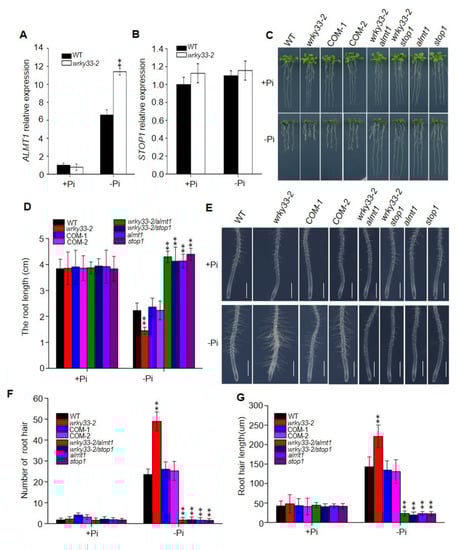 2.4. WRKY33 Intersects with ALMT1 to Regulate the Plant Pi Deficiency Responses