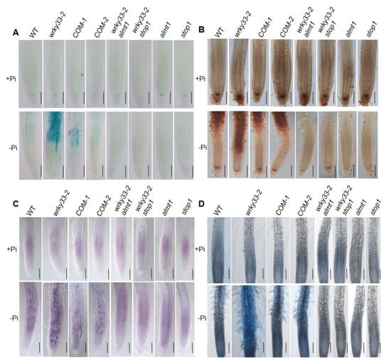 The accumulation of labile Fe3+ in root tips induces a potential Fe redox cycle that helps to generate ROS and promote callose deposition []. We further observed the ROS and callose deposition in roots. On the Pi-deficient medium, the ROS and callose deposition in wrky33-2 roots were much higher than those in wild-type, COM-1, and COM-2 roots (Figure 6C,D). Moreover, the almt1 wrky33-2 and stop1 wrky33-2 root exhibited diminished ROS and callose deposition under low Pi conditions, which is consistent with almt1 and stop1 mutants (Figure 6C,D). In conclusion, these results indicate that WRKY33 intersects with the ALMT1-mediated malate transport system to mediate the Pi deficiency responses.