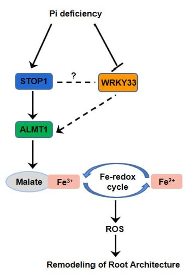 The WRKY family plays an important role in regulating the systemic response under Pi deficiency conditions. However, whether these TFs mediate the Pi-deficiency-induced remodeling of root structure is unclear. In this study, we revealed that Arabidopsis WRKY33 acted as a negative regulator to mediate the Pi deficiency-induced remodeling of RSA, including to inhibit the primary root growth and to enhance the root hair density and length. We further revealed that WRKY33 regulated the Fe homeostasis to respond to the low Pi signaling. Finally, we found that WRKY33 intersected with the STOP1-ALMT1 component to mediate Fe3+ deposition in root tips, which was followed by controlling root growth and root hair development. This study demonstrates a previously unrecognized signaling crosstalk between WRKY33 and the ALMT1-mediated malate transport system to regulate the Pi deficiency responses.